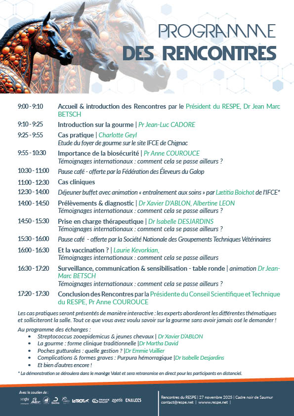 La 8ème édition des Rencontres du RESPE se dérouleront le jeudi 27 novembre 2025 au Cadre Noir de Saumur, une après-midi riche d'informations au sujet de la gourme et des autres infections à streptocoques.